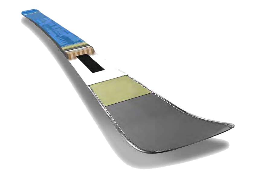 CSC Technology was successfully used in the Alpine Skiing World Cup. The carbon laminate visibly recognizable in the window is glue-laminated as appropriate for each end point. In the flex line, the carbon laminate flexes ideally so that the ski loses none of its perfect tuning. On strong impacts, the carbon laminate comes under tension through its specialized glue laminate at the ends, which results in less flattening out on the snow.